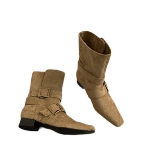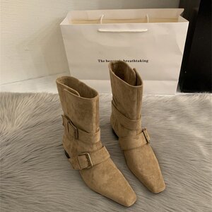2025韩版新款小众设计复古法式短靴小方头西部靴麂皮中筒靴女靴子