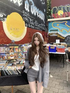 Suuuicee 灰柏林纪事 灰色慵懒连帽拉链毛衣外套低腰针织短裤套装