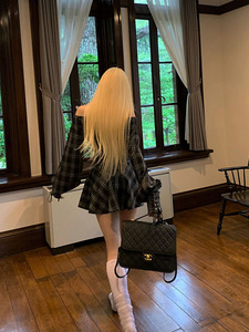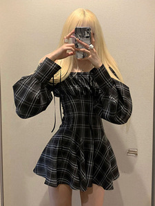 法式复古一字领格子长袖连衣裙女秋季新款气质少女风收腰显瘦短裙