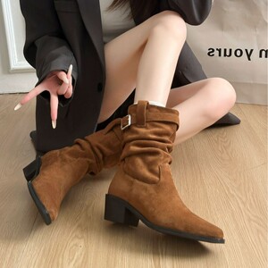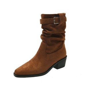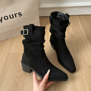 复古中筒方头皮带扣堆堆短靴女秋冬季新款粗高跟显瘦西部骑士靴子