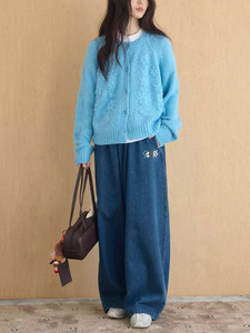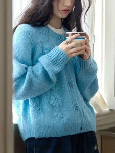 1313立体钩花!温柔显白baby蓝绵羊毛开衫秋季女叠穿亲肤针织毛衣