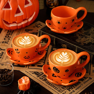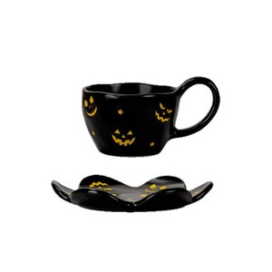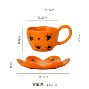 创意万圣节主题陶瓷杯碟不规则个性咖啡杯咖啡碟南瓜蝙蝠图案杯子
