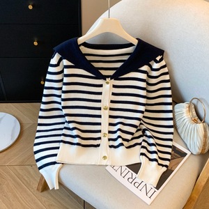 海军领蓝色条纹针织开衫女秋新款撞色v领薄款长袖外套上衣