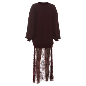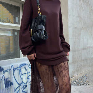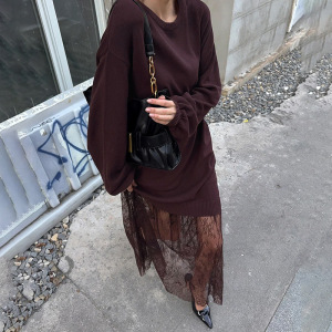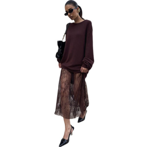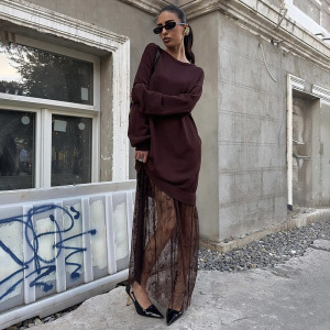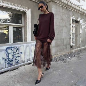 欧美风2025秋季外贸新款时尚气质街头纯色圆领宽松上衣蕾丝裙套装