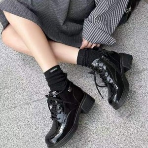 圆头裸靴女2025年秋冬新款舒适小短靴漆皮系带粗跟女靴深口时装靴
