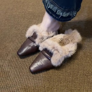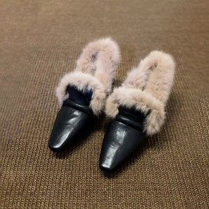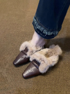 羊皮版~复古气质一脚蹬粗跟毛毛鞋外穿穆勒鞋方头加绒包头半拖鞋