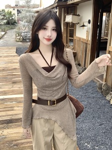 大码女装胖mm不规则美拉德设计感荡领长袖罩衫+吊带套装