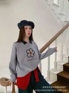 琪镌绘制秋季新款刺绣花朵套头宽松慵懒风撞色女装翻领卫衣潮6972