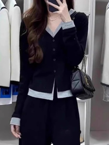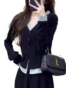 黑色假两件正肩V领长袖T恤女早秋新款打底衫修身显瘦针织开衫上衣