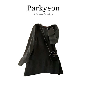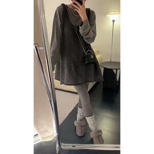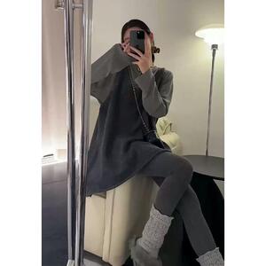 秋季新款韩系穿搭圆领长袖上衣卷边系带背带连衣裙套装
