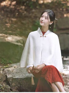 秋冬新款国风仿貂绒旗袍外搭披肩钉珠盘扣时尚短款斗篷纯色披风