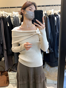 正品 气质小女人扭结一字领针织衫2025秋季新品设计感慵懒上衣
