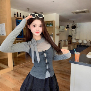 韩系辣妹蝴蝶结两件套长袖t恤女2025早秋季纯欲风修身打底衫上衣