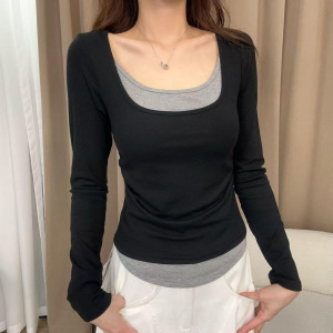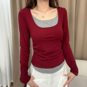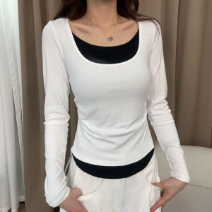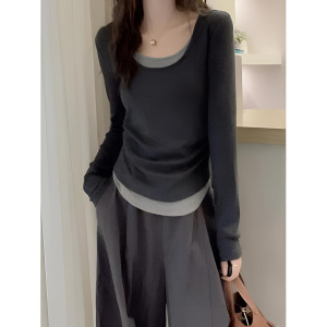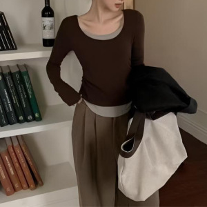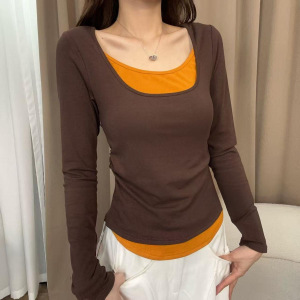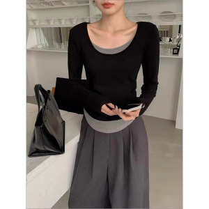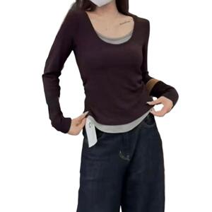 2025秋季新款假两件撞色圆领长袖T恤女宽松遮肚内搭打底衫上衣女