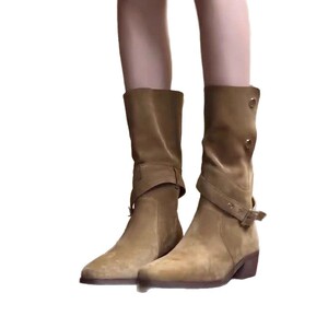 软皮版~帅气磨砂皮方头骑士靴皮带扣折翻两穿搭扣粗跟沙漠西部靴