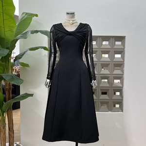 亚马逊2025秋季聚会端庄大方紧身扭结网纱长袖拼接收腰插袋连衣裙