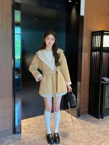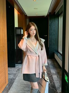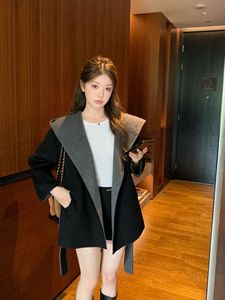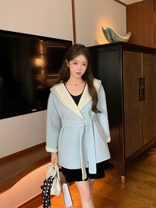 短款小个子收腰系带拼色双面羊毛大衣 浴袍款连帽双面羊绒大衣女