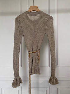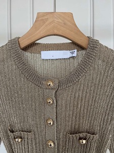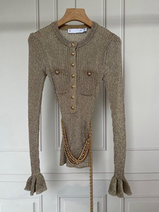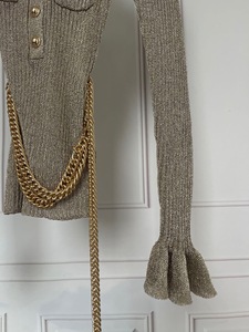 法式小众2025秋季新款千金风卡其色圆领金属扣链条收腰针织上衣女