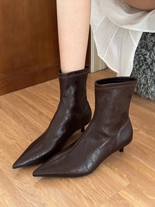 舒服好穿!复古棕色软皮猫跟短靴女秋季新款小矮跟靴