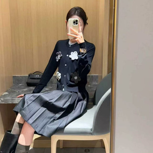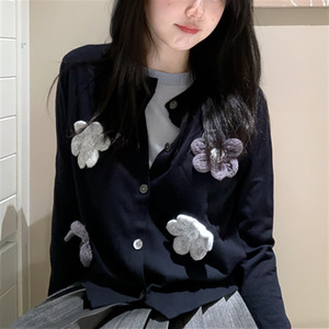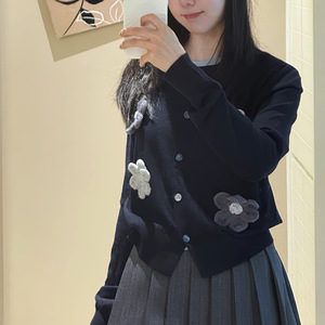 藏青色立体花朵毛衣女2025秋冬新款宽松慵懒针织开衫外套长袖上衣