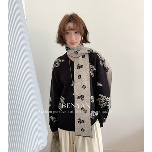 BENYAN本言 法式小众设计针织提花羊毛v领毛衣女【配围巾】3589
