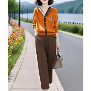 简约针织衫连帽外套松紧腰九分裤2025春秋新款欧货小个子两件套潮