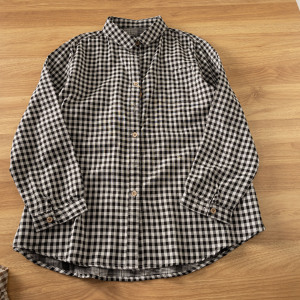 春秋新款文艺复古格子翻领双层棉纱长袖衬衫女宽松休闲百搭口袋上