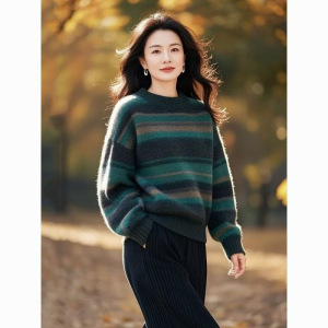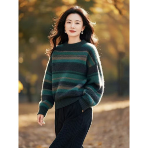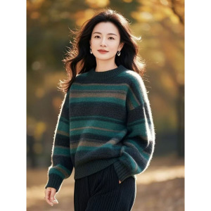 慵懒风高级撞色条纹圆领厚毛衣女款2025冬内搭上衣针织衫上衣