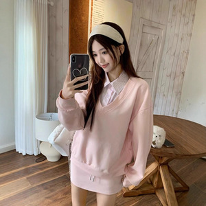 韩系甜美假两件拼接polo领卫衣女春秋2025新款宽松百搭学院风上衣