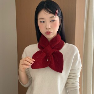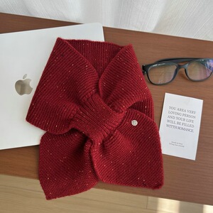 2025新款秋冬韩系氛围感红色100%纯羊毛交叉小围巾女保暖针织围脖