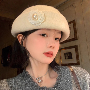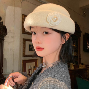 法式千金风山茶花珍珠白色礼帽女秋冬高级感显脸小贝雷帽复古盆帽
