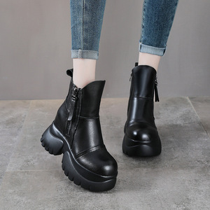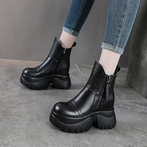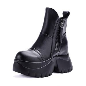 头层牛皮内增高短靴真皮拉链女鞋秋冬新款松糕高跟单鞋厚底马丁靴