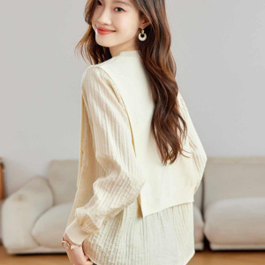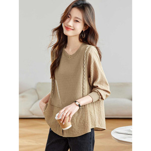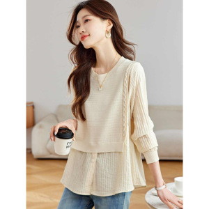垂坠感假两件针织拼接长袖衬衫女春秋装新款宽松洋气遮肚打底上衣