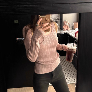 舒适u领长袖打底T恤女春秋季新款韩系气质收腰修身显瘦休闲针织衫