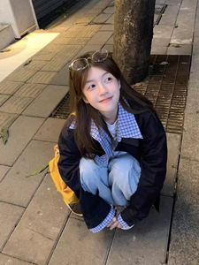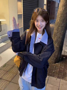 美式复古格子拼接假两件外套女秋冬宽松翻领感夹克棒球服上衣