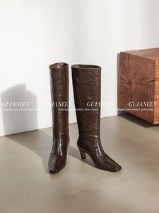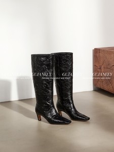 欧洲站女鞋25秋冬时尚软手抓纹胎牛皮小方头舒适套筒小猫低跟长靴