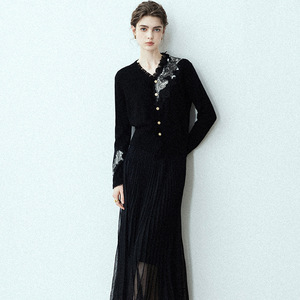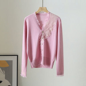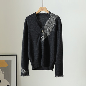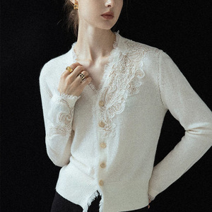 法式优雅蕾丝花边V领金扣修身小香风纯羊毛针织开衫短款毛衣外套