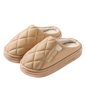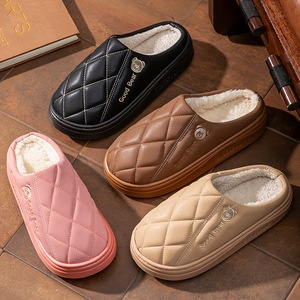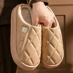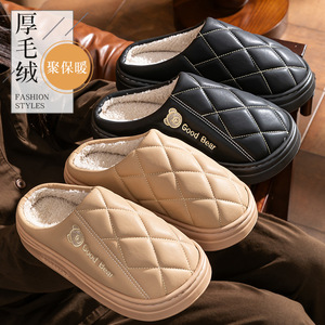 新款pu皮防水棉拖鞋女秋冬季居家厚底防滑外穿加绒保暖月子棉鞋男