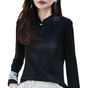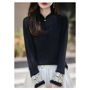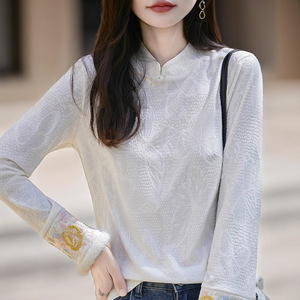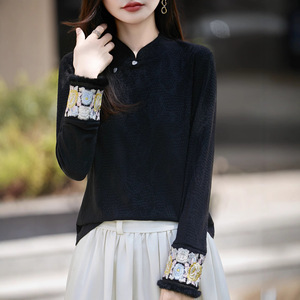 新中式气质立领斜襟盘扣长袖打底小衫女秋冬时尚提花国风刺绣衬衣