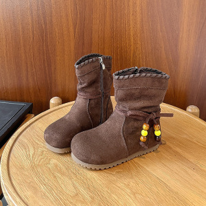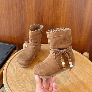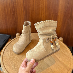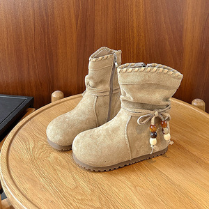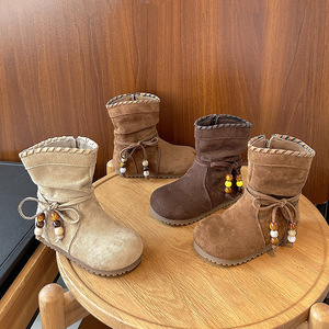 女童复古平底勃肯靴子2025秋冬季新款美拉德流苏蝴蝶结中筒马丁靴