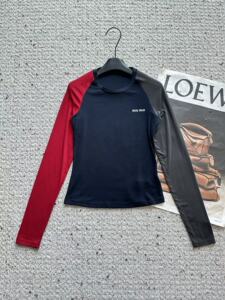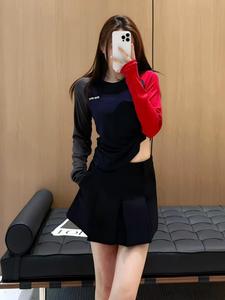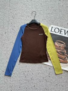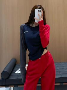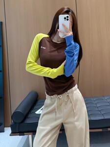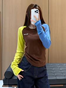 羊毛圆领上衣多巴胺拼接撞色t恤南油女正肩气质显身材长袖打底衫