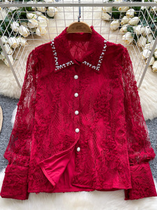 法式轻奢名媛重工钉钻翻领长袖单排扣蕾丝上衣女秋季百搭显瘦衬衫
