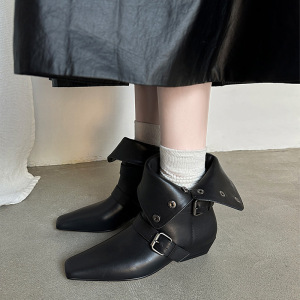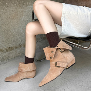 2025秋冬新款设计感小众翻领靴复古方头骑士靴皮带扣绒面粗跟短靴
