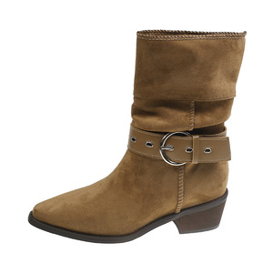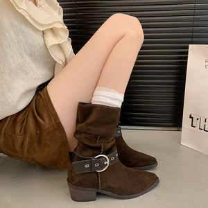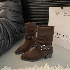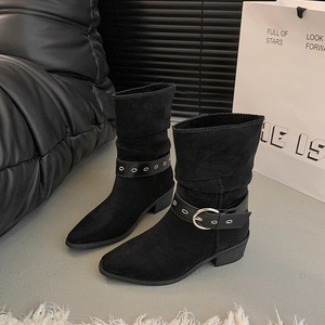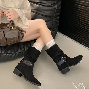 2025年秋冬季新款堆堆靴粗跟套筒瘦瘦短靴舒适轻便西部靴尖头女靴
