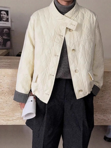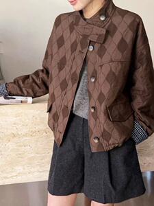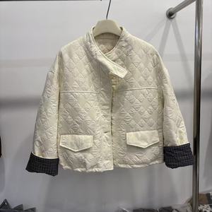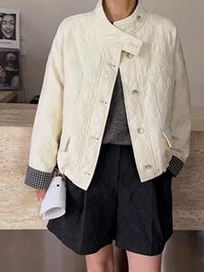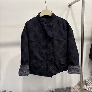 韩系立领格子拼接薄棉服女外套2025秋季新款宽松小个子夹棉外套潮