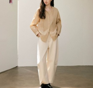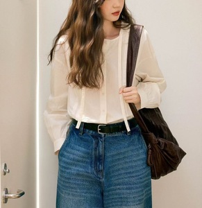 念Bai 100棉法式轻薄柔软简约气质宽松系带压褶圆领长袖衬衫秋季