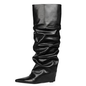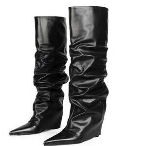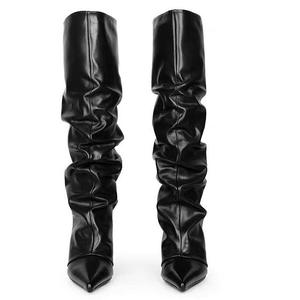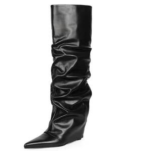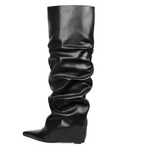 欧美外贸新款欧美风尖头皱皱靴超高跟坡跟长筒女士时装及膝堆堆靴