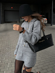 欧美亚马逊树脂纽扣毛衣套装POLO领灰色跨境外贸女装拉链两件套