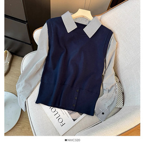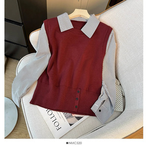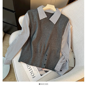 韩系假两件撞色条纹针织拼接翻领衬衫女秋冬季宽松减龄百搭上衣女