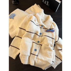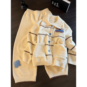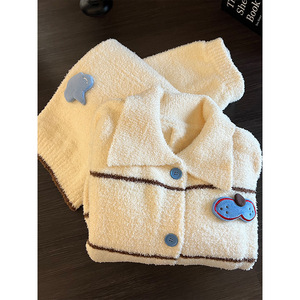 甜美可爱酷猫条纹撞色半边绒睡衣女冬季新款休闲保暖家居服两件套